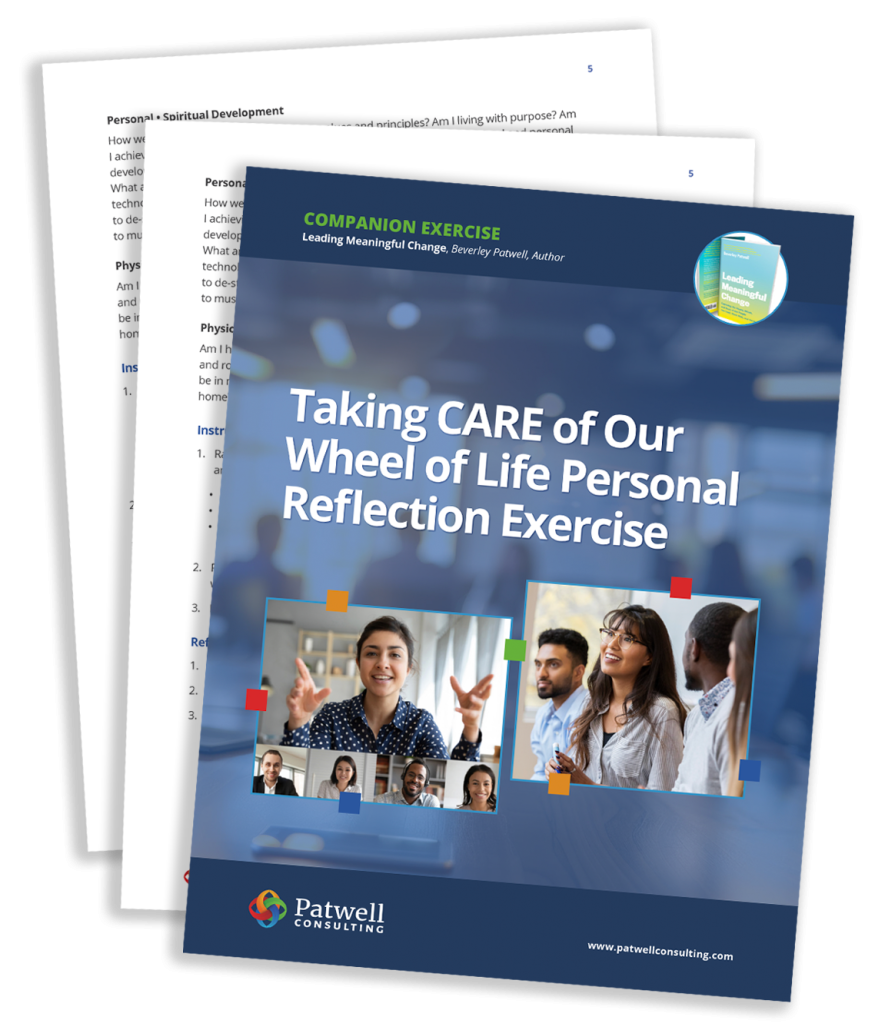 This exercise is designed to help you reflect on and evaluate how you are moving through your life now, and as you plan for the future. The CARE model is based on input from over 700 participants who attended our Leading Meaningful Change programs during COVID. By completing The Wheel of Life exercise, you will have a visual impression of how you are doing and strategies to help you take CARE of yourself and others. This exercise is useful for people of all ages living and leading through change and transition.